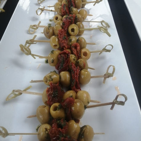 Skewered Olives, Basil Infused Feta and Sun Blushed Tomatoes