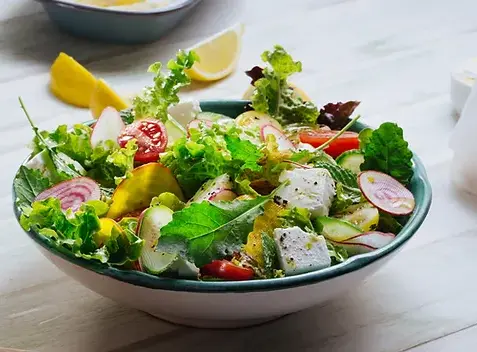 A fresh crisp green salad (With leaves, onions, tomatoes and cucumber)
